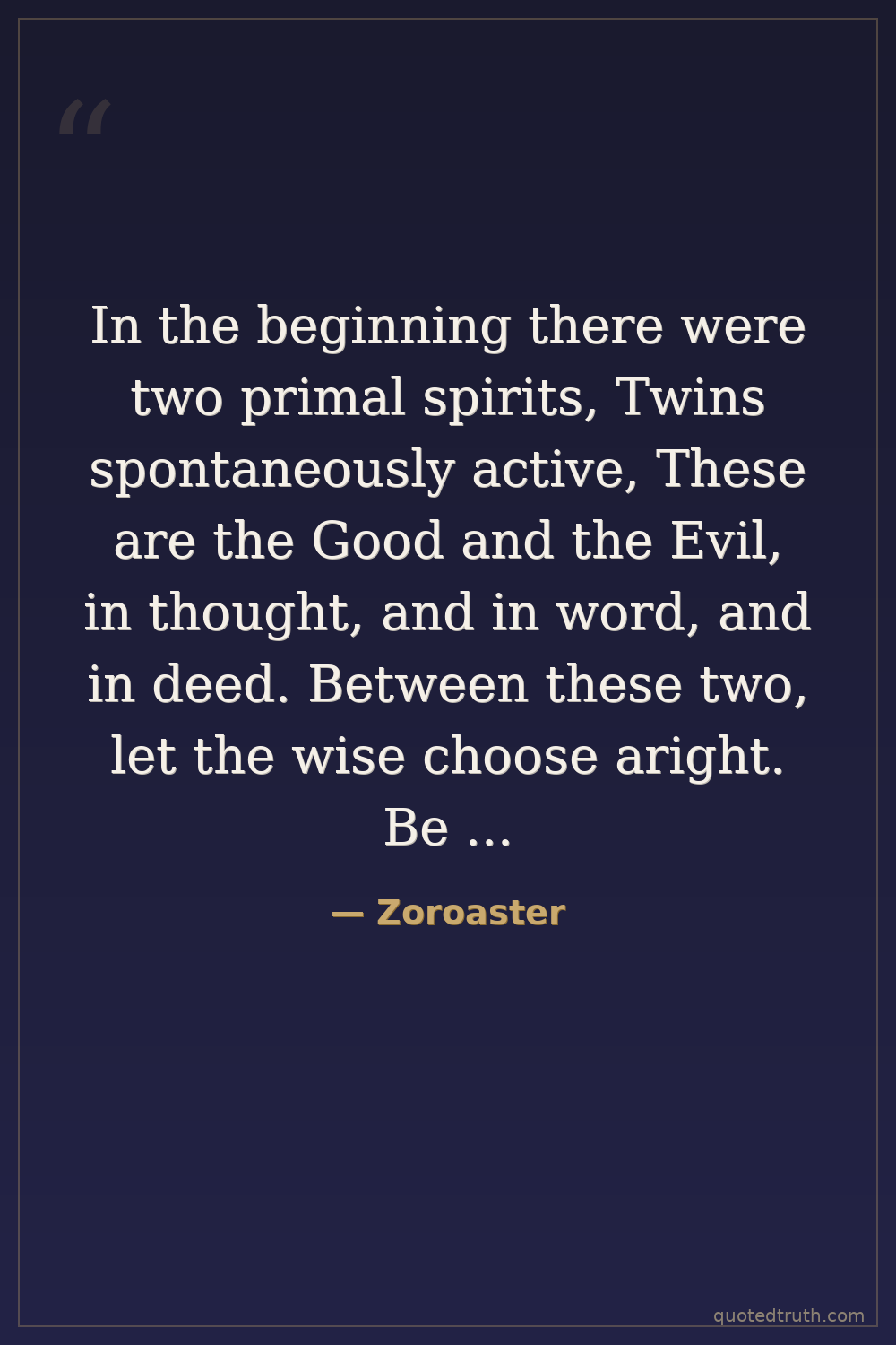 In the beginning there were two primal spirits, Twins spontaneously active, These are the Good and the Evil, in thought, and in word, and in deed. Between these two, let the wise choose aright. Be good, not base!