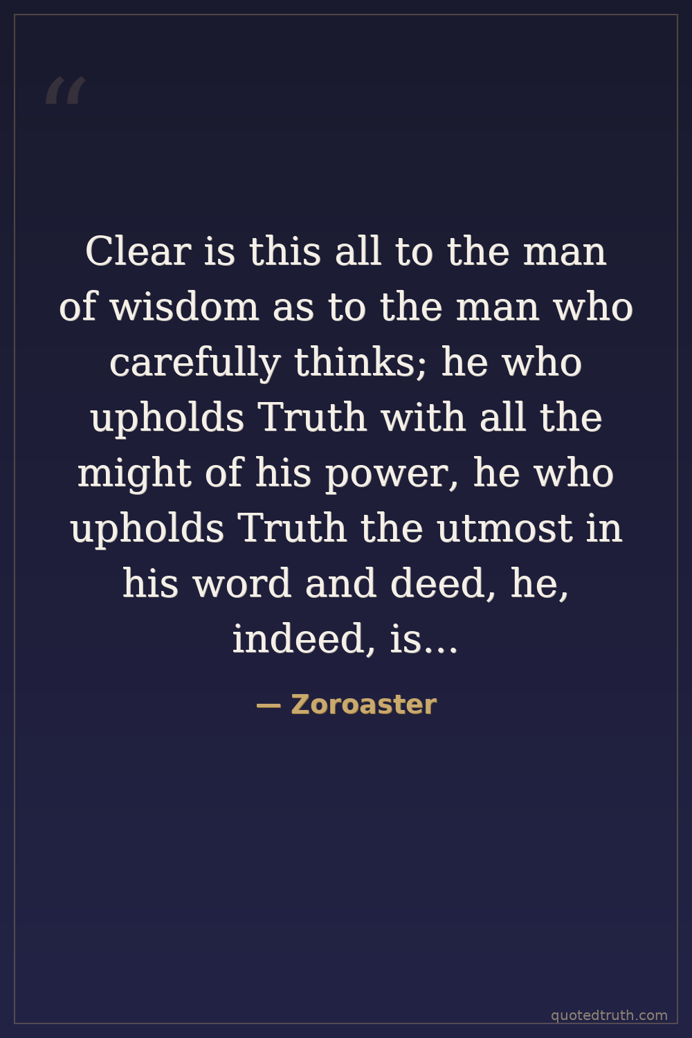 Clear is this all to the man of wisdom as to the man who carefully thinks; he who upholds Truth with all the might of his power, he who upholds Truth the utmost in his word and deed, he, indeed, is thy most valued helper, O Mazda Ahura!. — Zoroaster Ancient Founder of Zoroastrianism