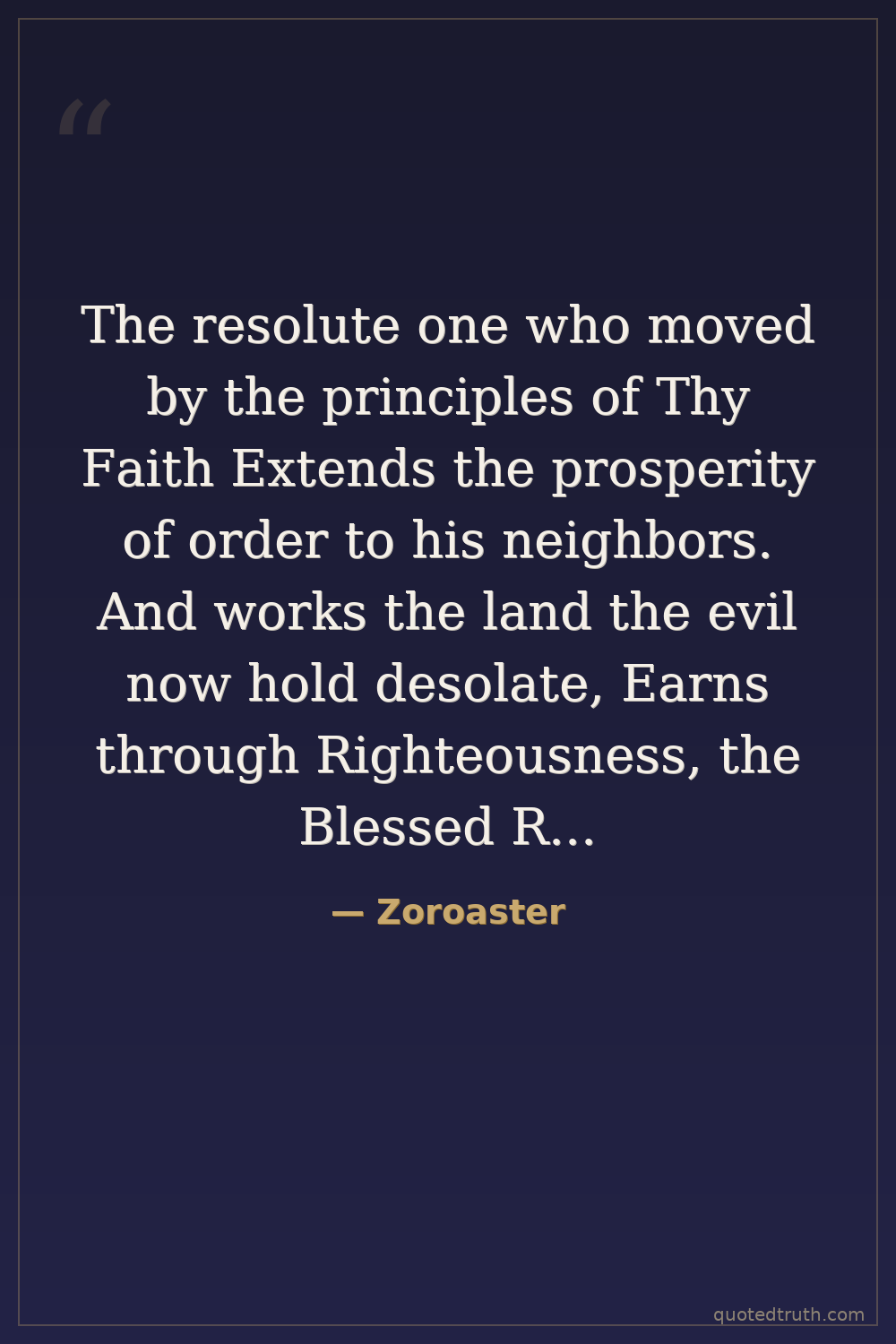 The resolute one who moved by the principles of Thy Faith Extends the prosperity of order to his neighbors. And works the land the evil now hold desolate, Earns through Righteousness, the Blessed Recompense Thy Good Mind has promised in Thy Kingdom of Heaven.
