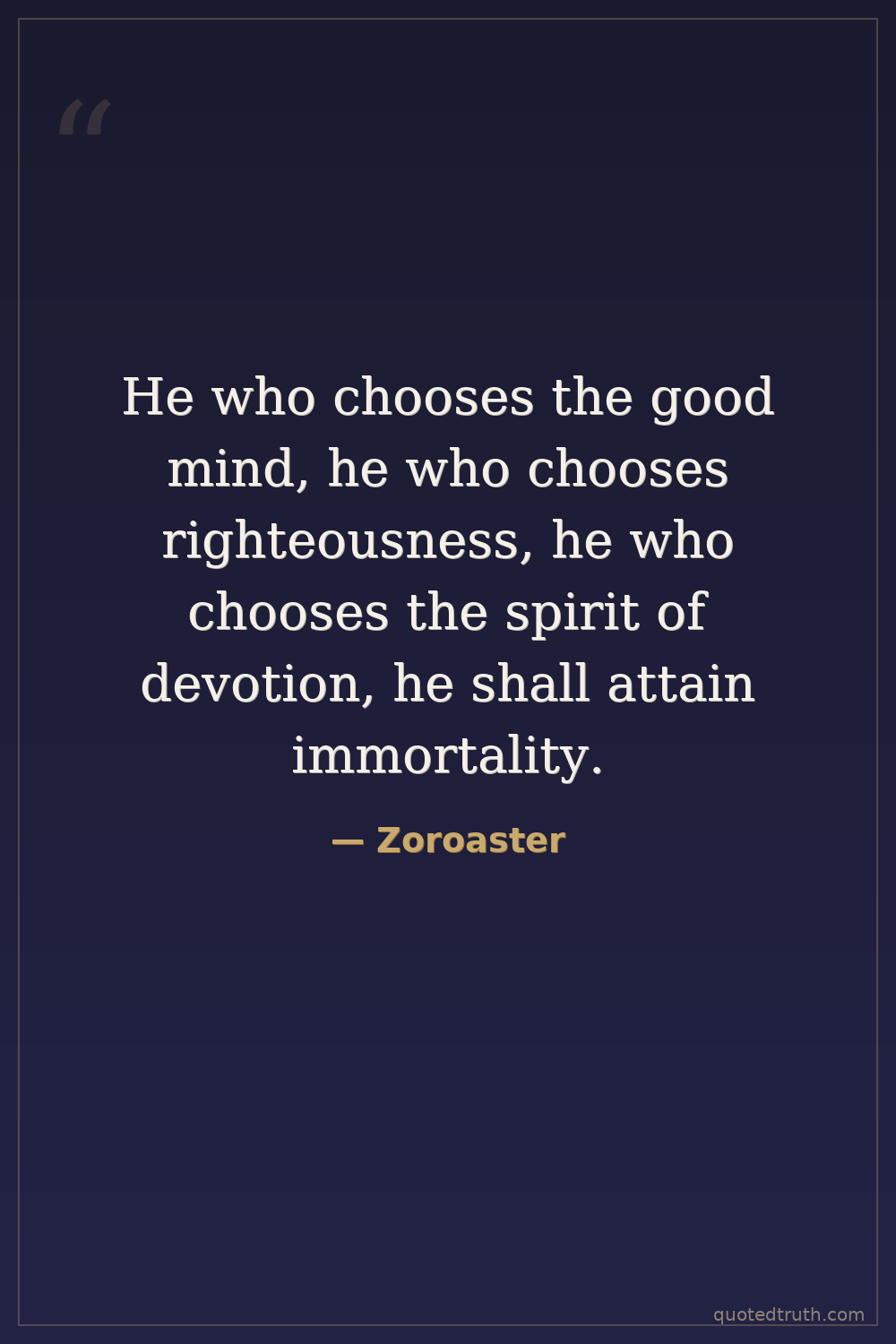 He who chooses the good mind, he who chooses righteousness, he who chooses the spirit of devotion, he shall attain immortality.