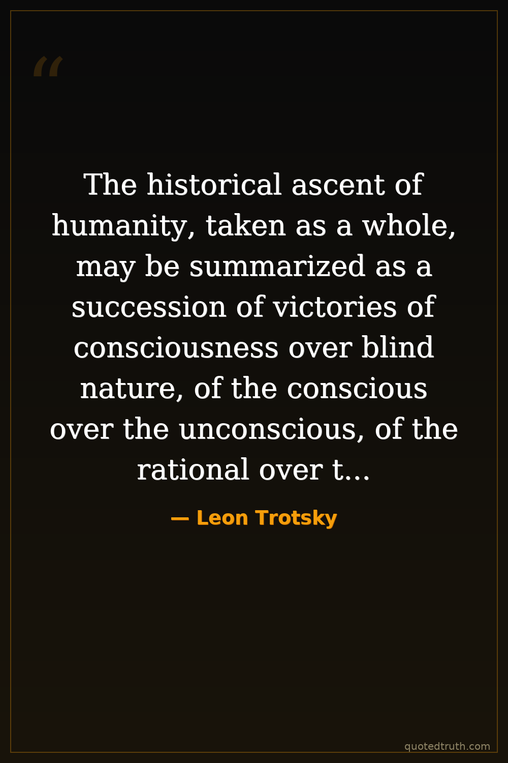 The historical ascent of humanity, taken as a whole, may be summarized as a succession of victories of consciousness over blind nature, of the conscious over the unconscious, of the rational over the instinctive, of the planned over the elemental.