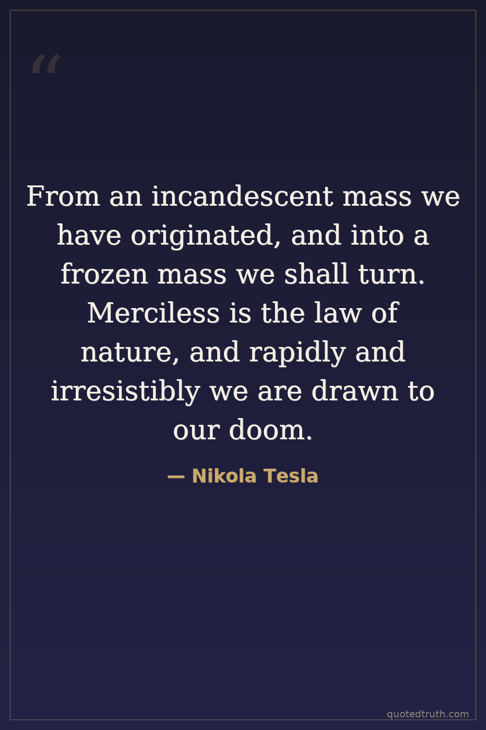 From an incandescent mass we have originated, and into a frozen mass we shall turn. Merciless is the law of nature, and rapidly and irresistibly we are drawn to our doom.