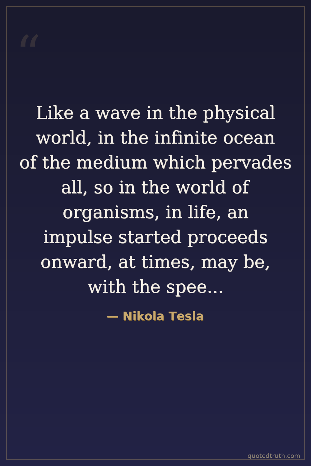 Like a wave in the physical world, in the infinite ocean of the medium which pervades all, so in the world of organisms, in life, an impulse started proceeds onward, at times, may be, with the speed of light, at times, again, so slowly that for ages and ages it seems to stay, passing through processes of a complexity inconceivable to men, but in all its forms, in all its stages, its energy ever and ever integrally present.