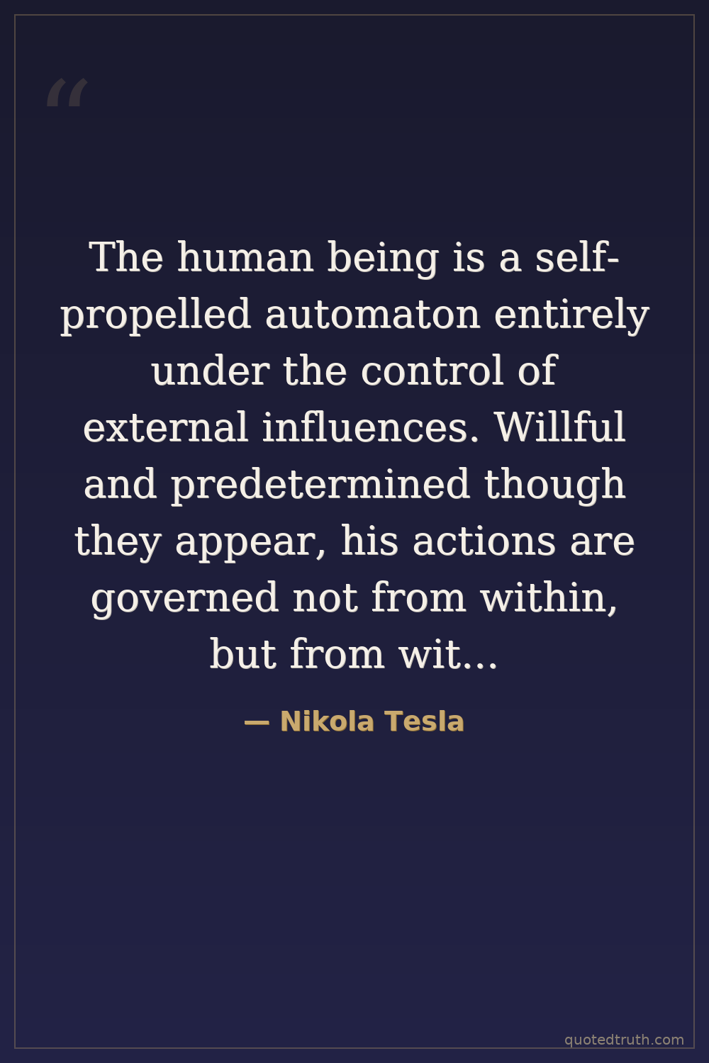 The human being is a self-propelled automaton entirely under the control of external influences. Willful and predetermined though they appear, his actions are governed not from within, but from without. He is like a float tossed about by the waves of a turbulent sea.