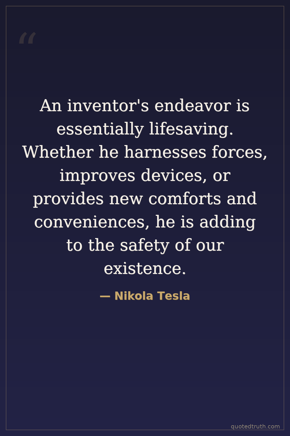 An inventor's endeavor is essentially lifesaving. Whether he harnesses forces, improves devices, or provides new comforts and conveniences, he is adding to the safety of our existence.