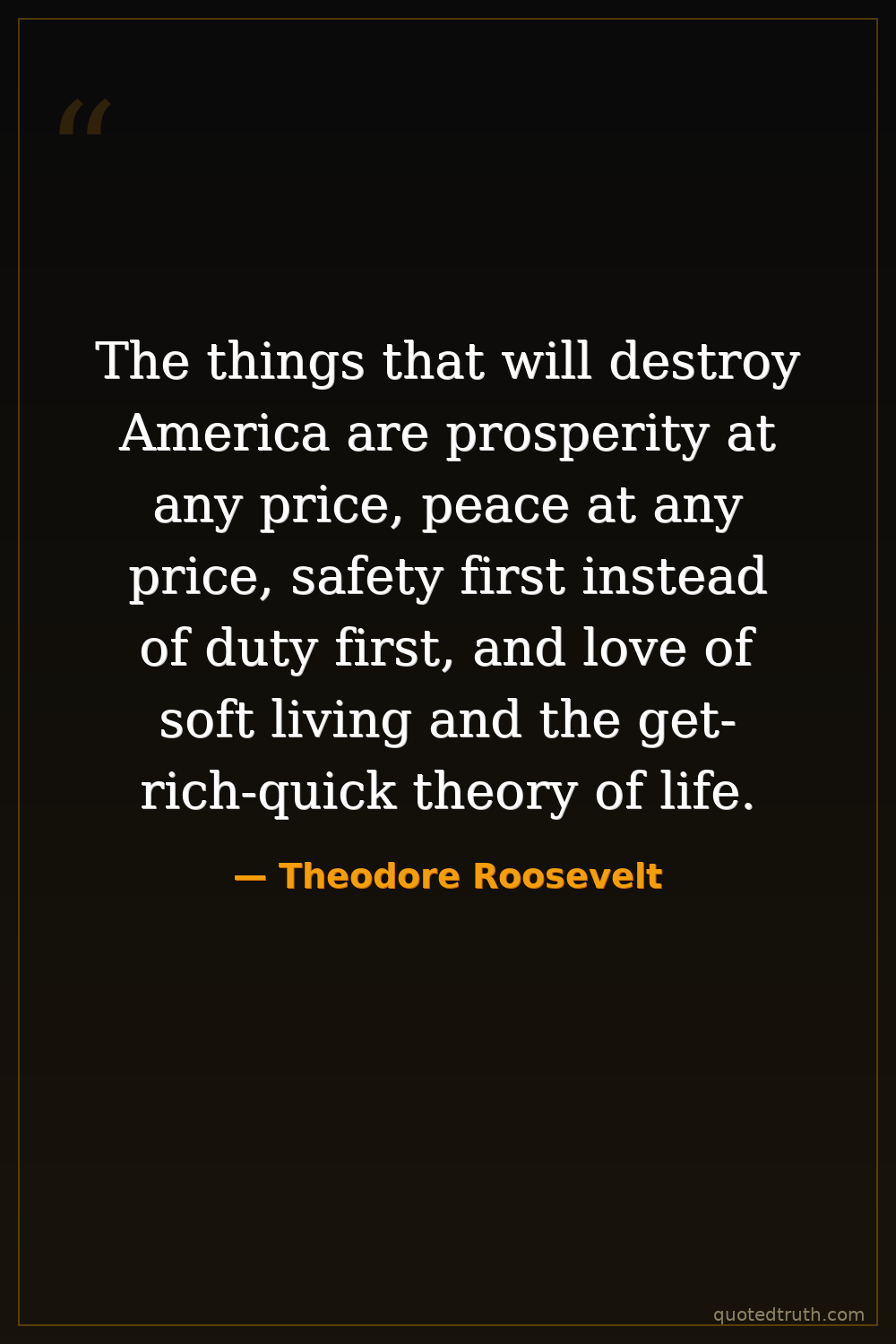 The things that will destroy America are prosperity at any price, peace at any price, safety first instead of duty first, and love of soft living and the get-rich-quick theory of life.