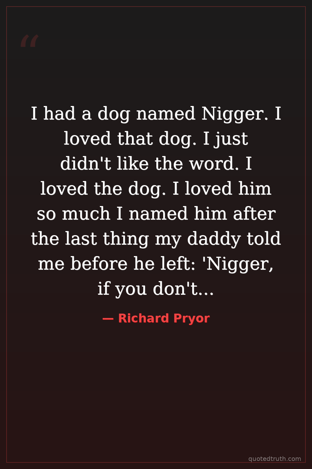 I had a dog named Nigger. I loved that dog. I just didn't like the word. I loved the dog. I loved him so much I named him after the last thing my daddy told me before he left: 'Nigger, if you don't get your ass in this house...'