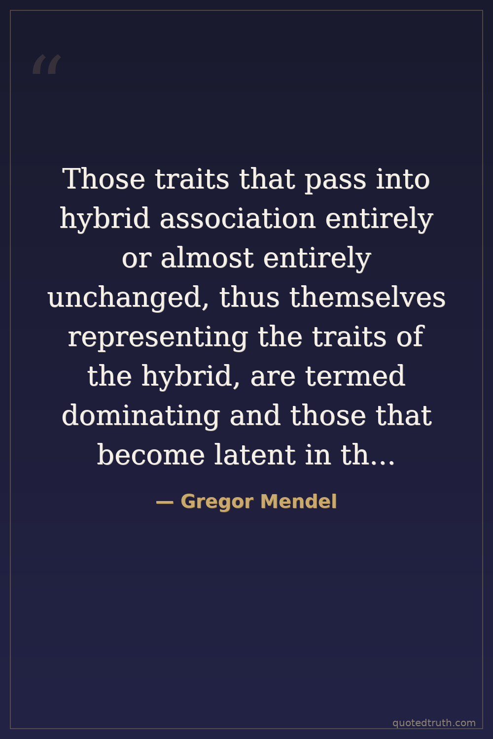 Those traits that pass into hybrid association entirely or almost entirely unchanged, thus themselves representing the traits of the hybrid, are termed dominating and those that become latent in the association, recessive.