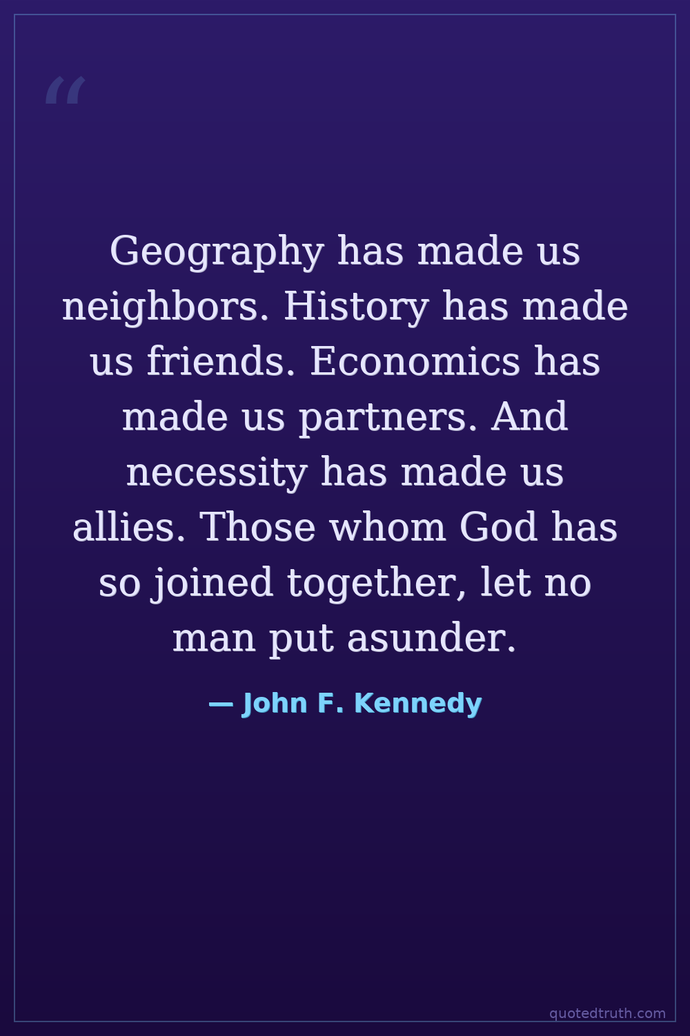 Geography has made us neighbors. History has made us friends. Economics has made us partners. And necessity has made us allies. Those whom God has so joined together, let no man put asunder.
