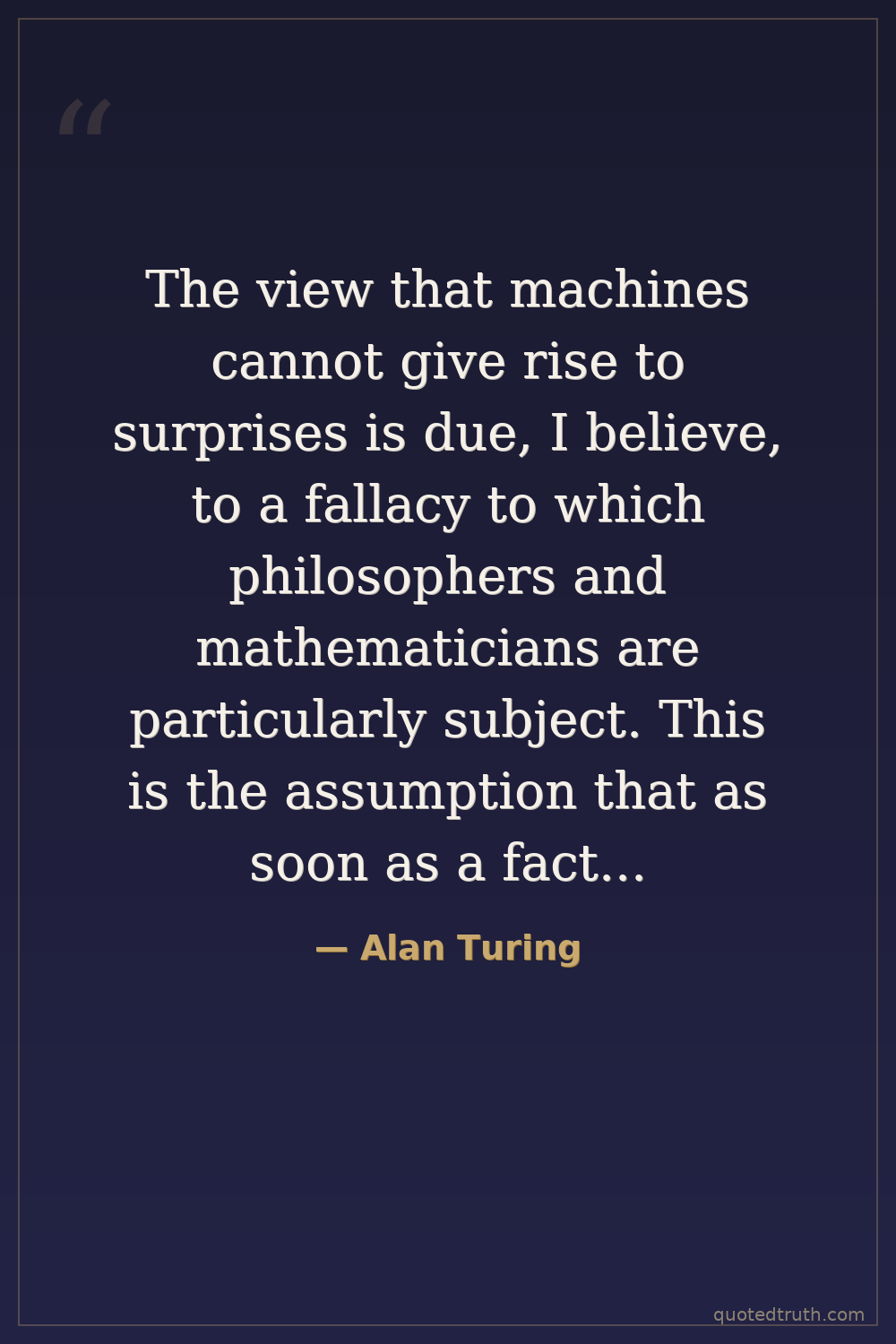 The view that machines cannot give rise to surprises is due, I believe, to a fallacy to which philosophers and mathematicians are particularly subject. This is the assumption that as soon as a fact is presented to a mind all consequences of that fact spring into the mind simultaneously with it. It is a very useful assumption under many circumstances, but one too easily forgets that it is false.
