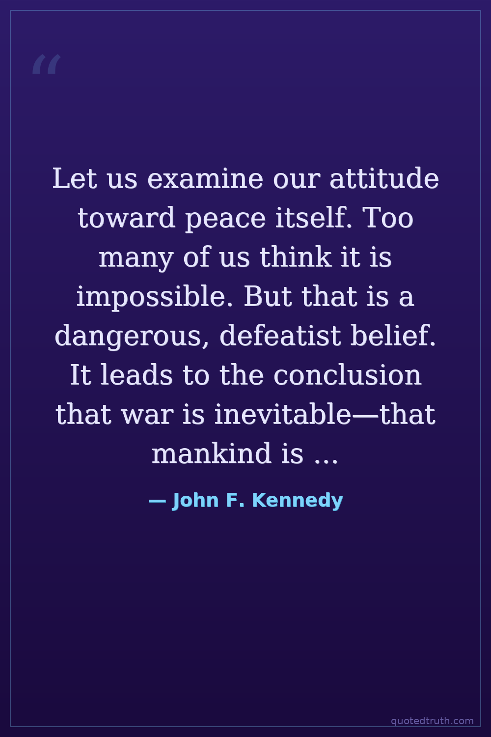 Let us examine our attitude toward peace itself. Too many of us think it is impossible. But that is a dangerous, defeatist belief. It leads to the conclusion that war is inevitable—that mankind is doomed—that we are gripped by forces we cannot control.
