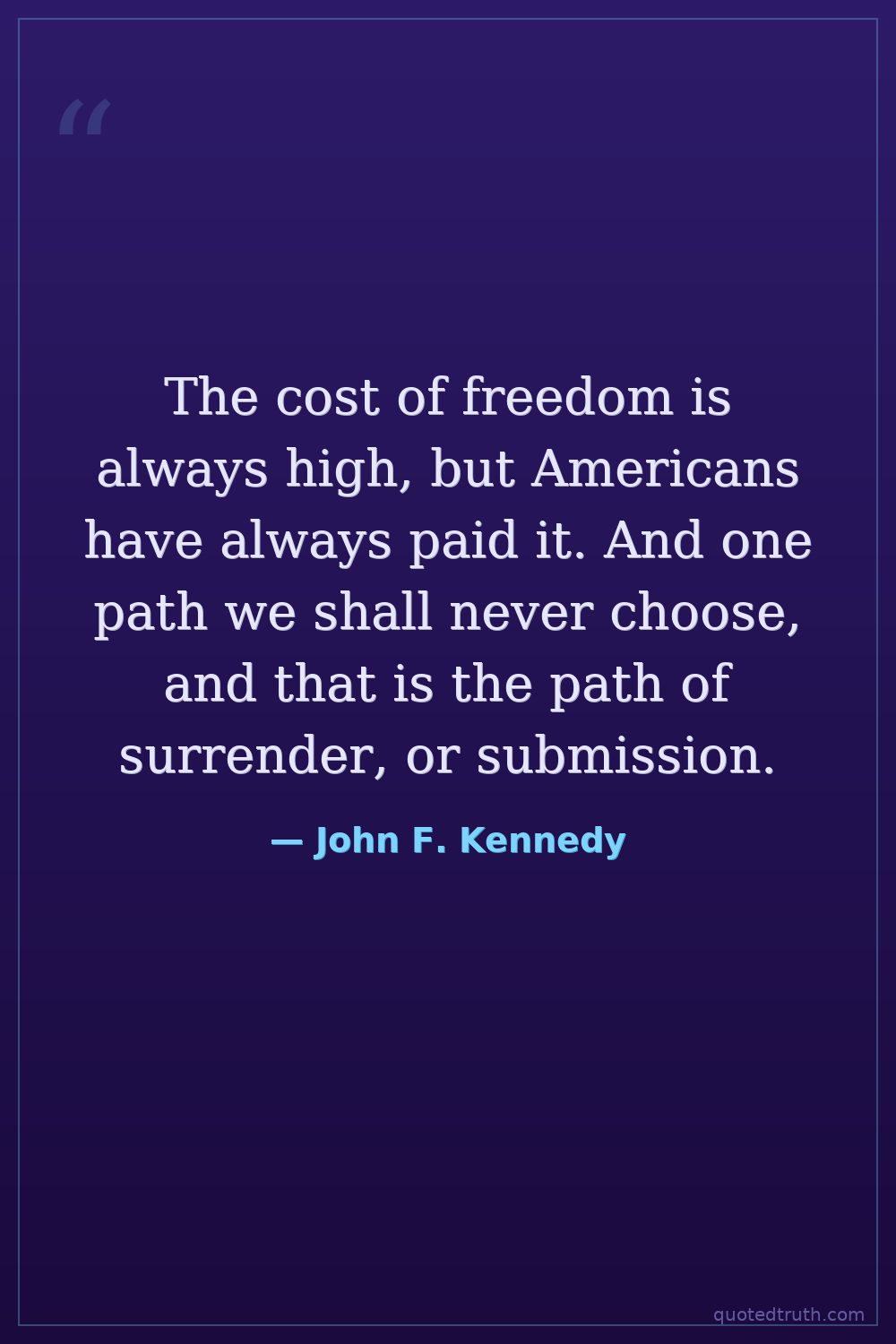 The cost of freedom is always high, but Americans have always paid it. And one path we shall never choose, and that is the path of surrender, or submission.