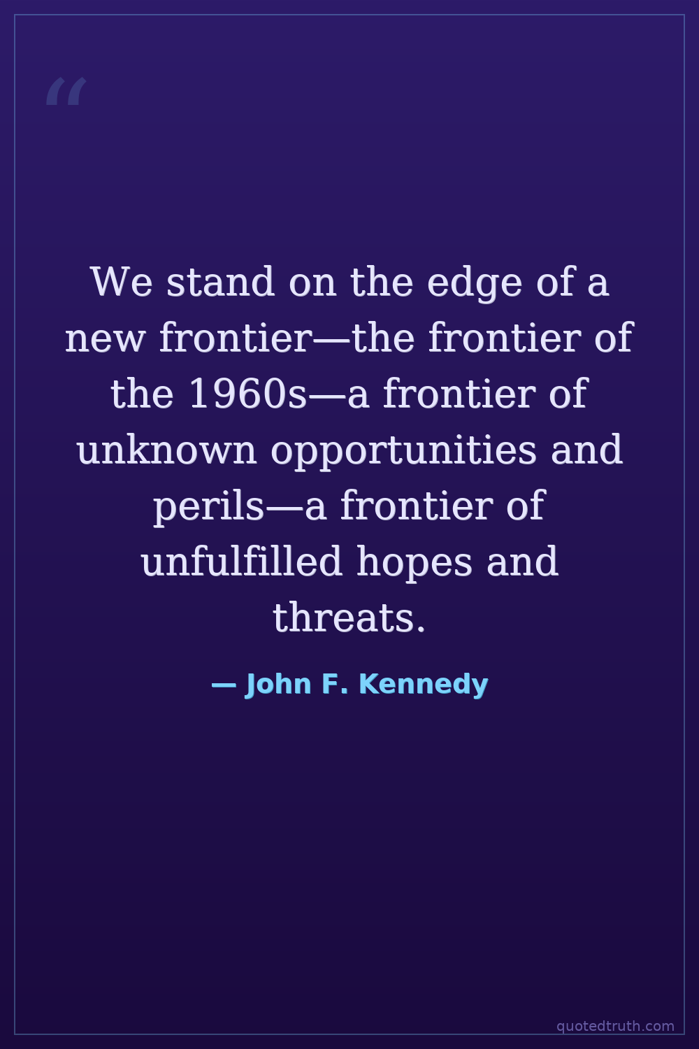 We stand on the edge of a new frontier—the frontier of the 1960s—a frontier of unknown opportunities and perils—a frontier of unfulfilled hopes and threats.