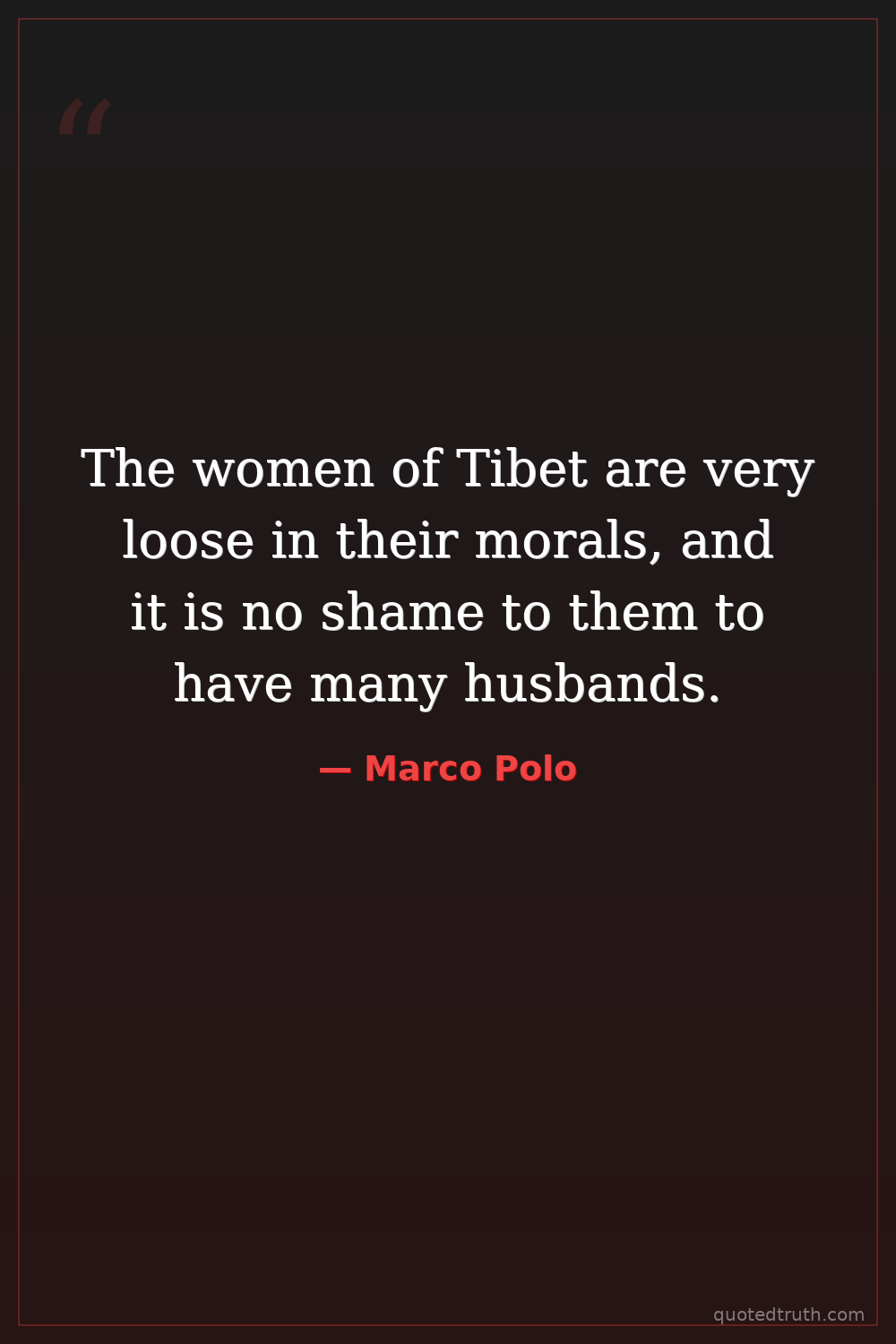 The women of Tibet are very loose in their morals, and it is no shame to them to have many husbands.