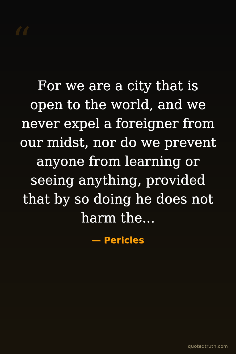For we are a city that is open to the world, and we never expel a foreigner from our midst, nor do we prevent anyone from learning or seeing anything, provided that by so doing he does not harm the state.