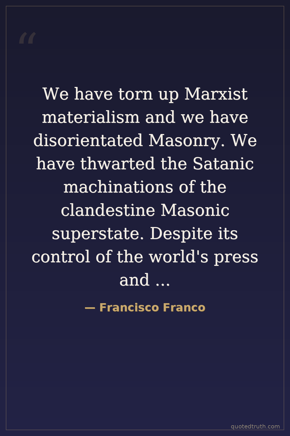 We have torn up Marxist materialism and we have disorientated Masonry. We have thwarted the Satanic machinations of the clandestine Masonic superstate. Despite its control of the world's press and numerous international politicians. Spain's struggle is a Crusade; as soldiers of God we carry with us the evangelism of the world!