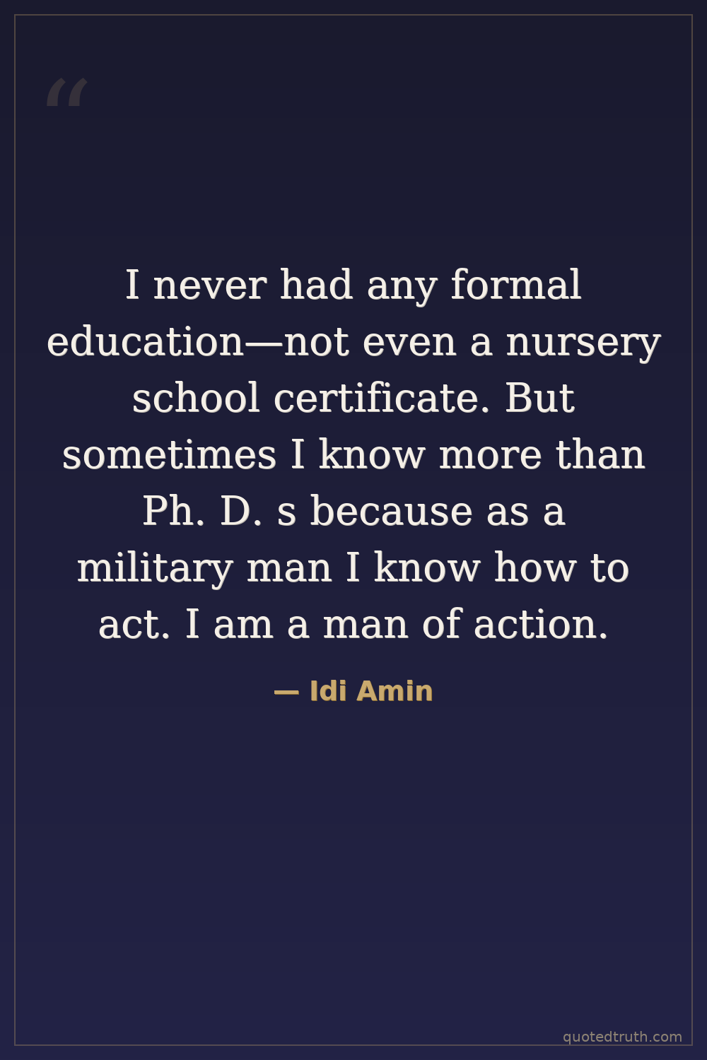 I never had any formal education—not even a nursery school certificate. But sometimes I know more than Ph. D. s because as a military man I know how to act. I am a man of action.