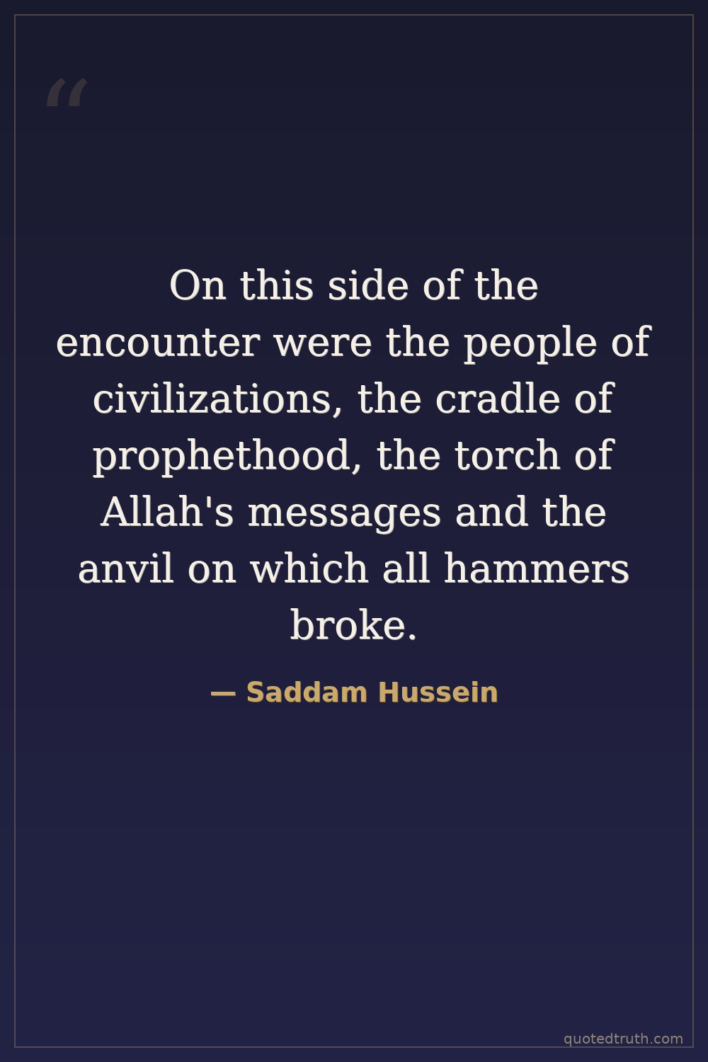 On this side of the encounter were the people of civilizations, the cradle of prophethood, the torch of Allah's messages and the anvil on which all hammers broke.