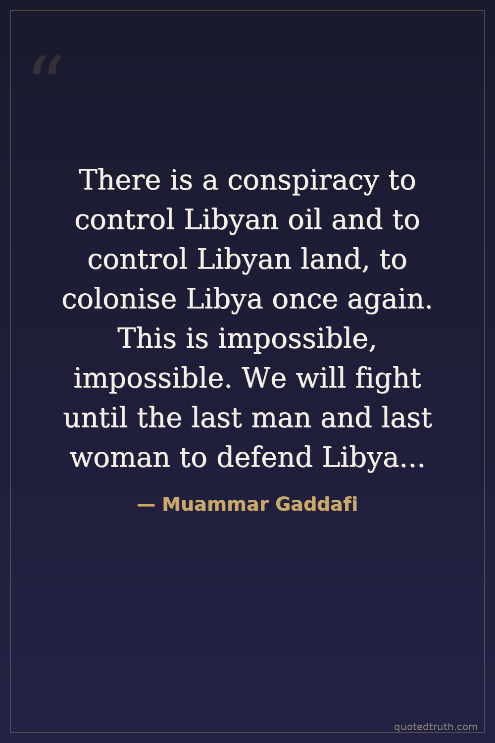 There is a conspiracy to control Libyan oil and to control Libyan land, to colonise Libya once again. This is impossible, impossible. We will fight until the last man and last woman to defend Libya from east to west, north to south.