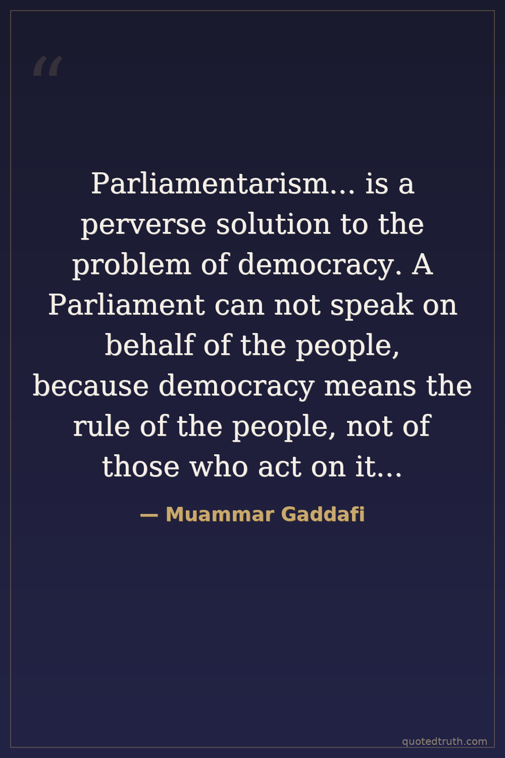 Parliamentarism... is a perverse solution to the problem of democracy. A Parliament can not speak on behalf of the people, because democracy means the rule of the people, not of those who act on its behalf.