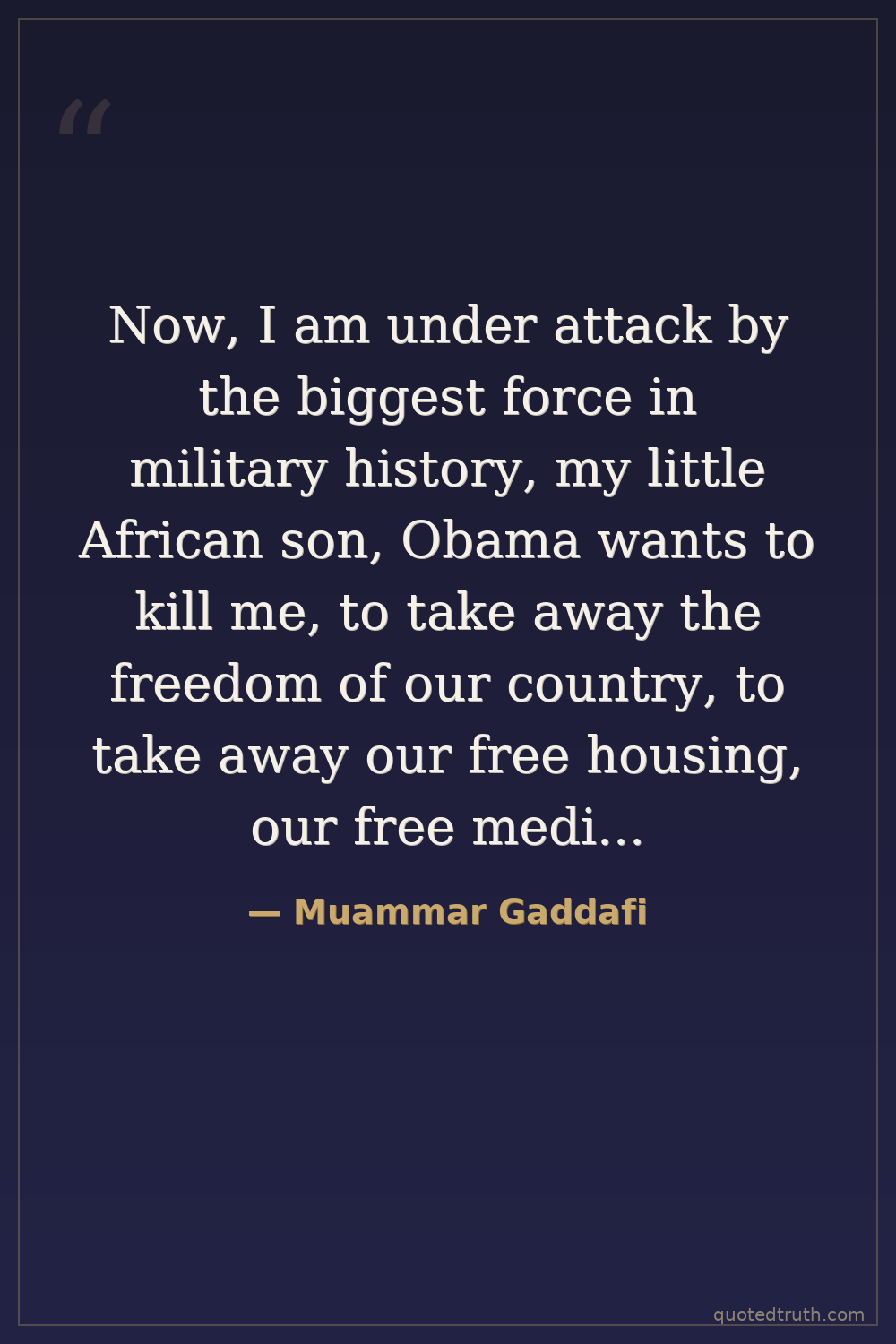 Now, I am under attack by the biggest force in military history, my little African son, Obama wants to kill me, to take away the freedom of our country, to take away our free housing, our free medicine, our free education, our free food, and replace it with American style thievery, called “capitalism”, but all of us in the Third World know what that means, it means corporations run the countries, run the world, and the people suffer.
