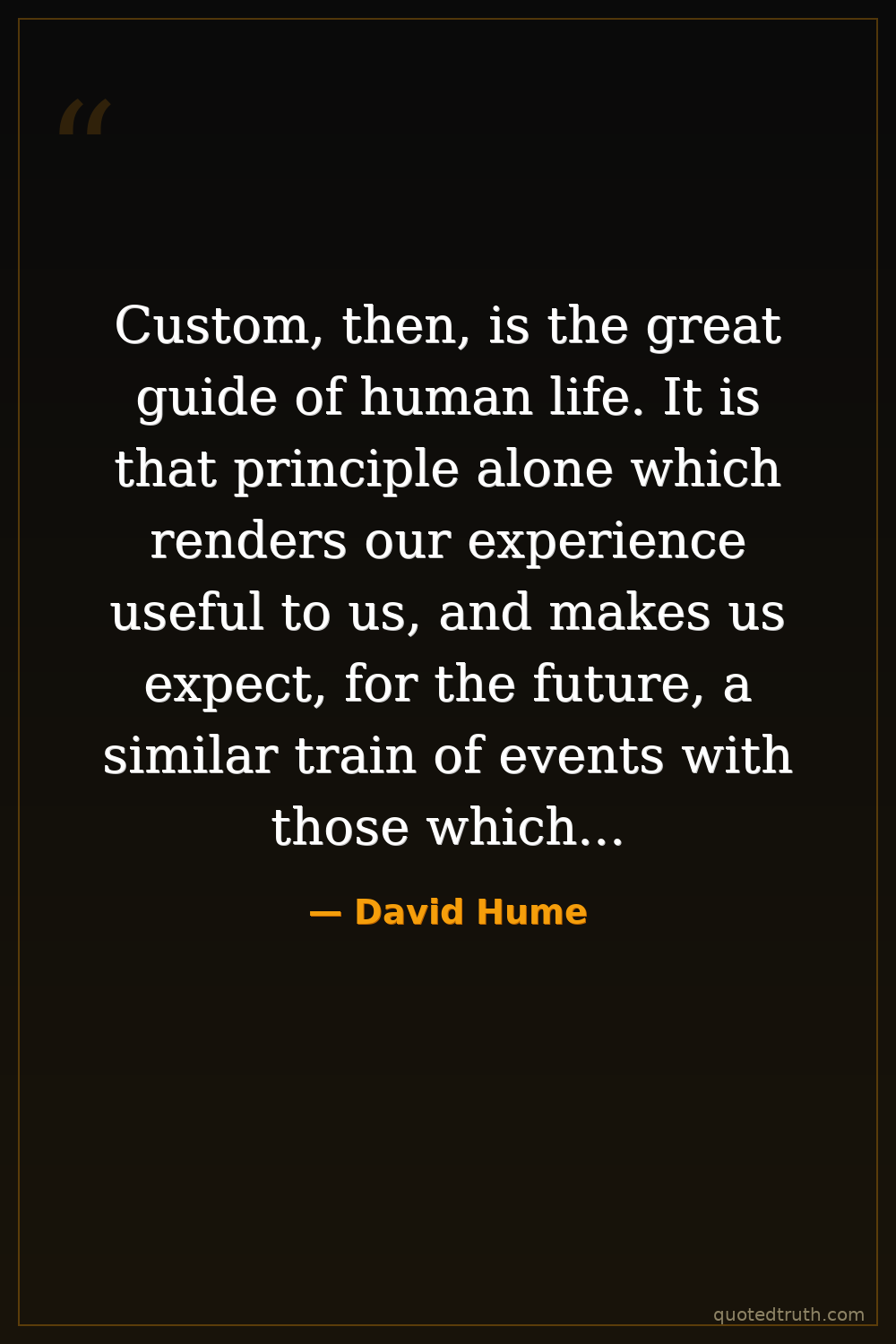 Custom, then, is the great guide of human life. It is that principle alone which renders our experience useful to us, and makes us expect, for the future, a similar train of events with those which have appeared in the past.