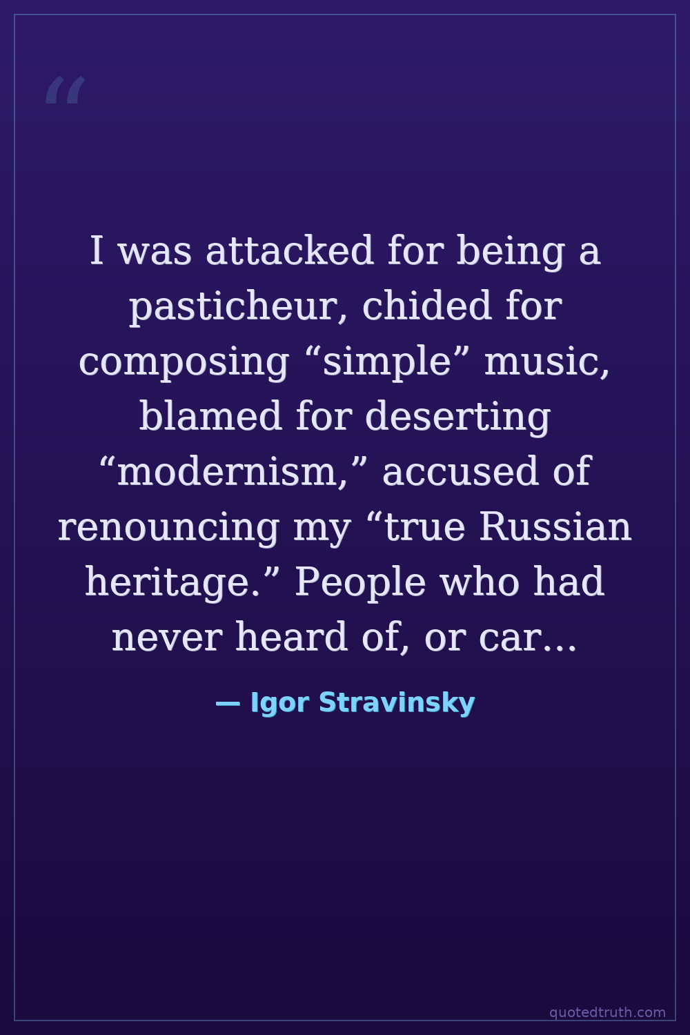I was attacked for being a pasticheur, chided for composing “simple” music, blamed for deserting “modernism,” accused of renouncing my “true Russian heritage.” People who had never heard of, or cared about, the originals cried “sacrilege”: “The classics are ours. Leave the classics alone.” To them all my answer was and is the same: You “respect,” but I love.