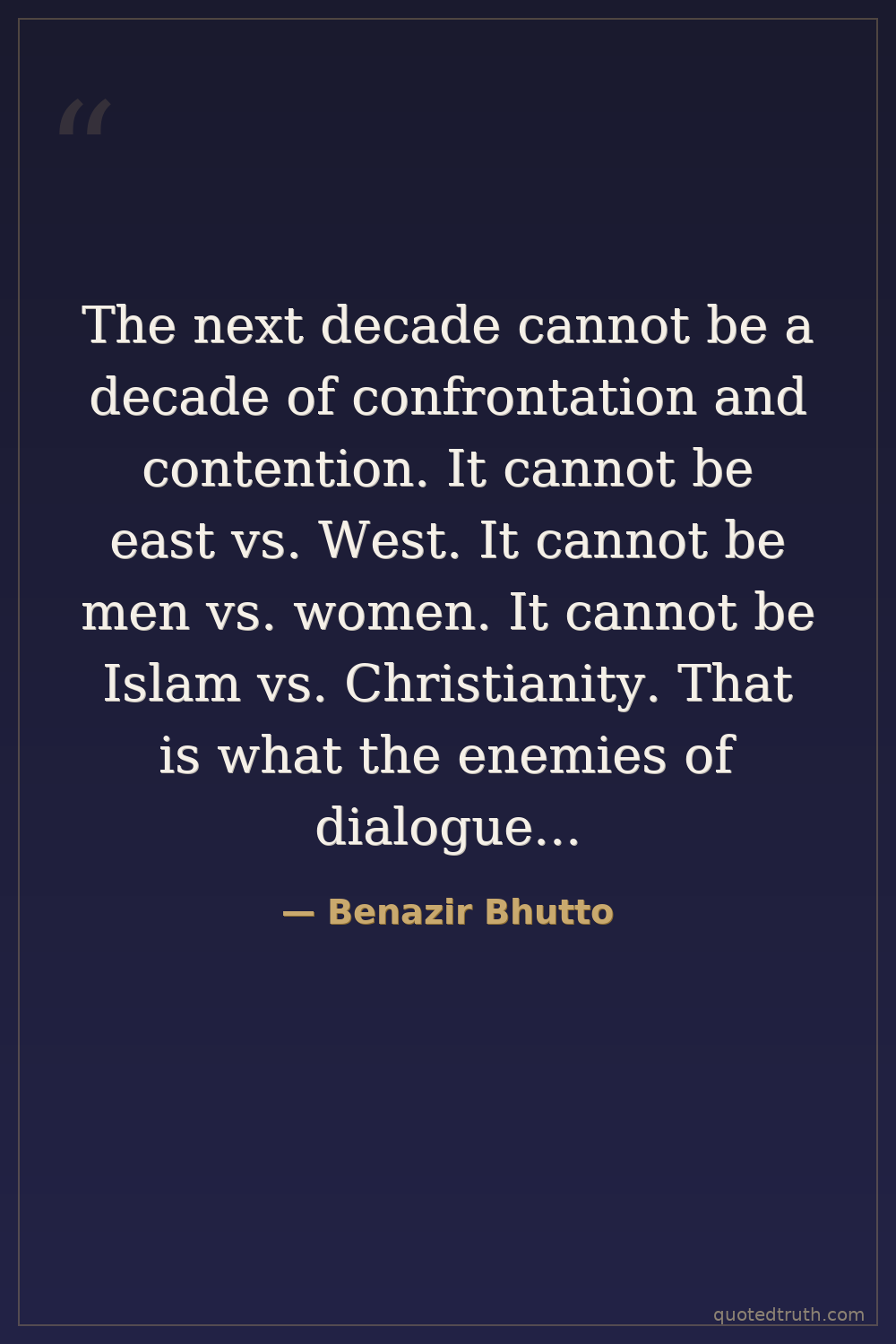 The next decade cannot be a decade of confrontation and contention. It cannot be east vs. West. It cannot be men vs. women. It cannot be Islam vs. Christianity. That is what the enemies of dialogue want.
