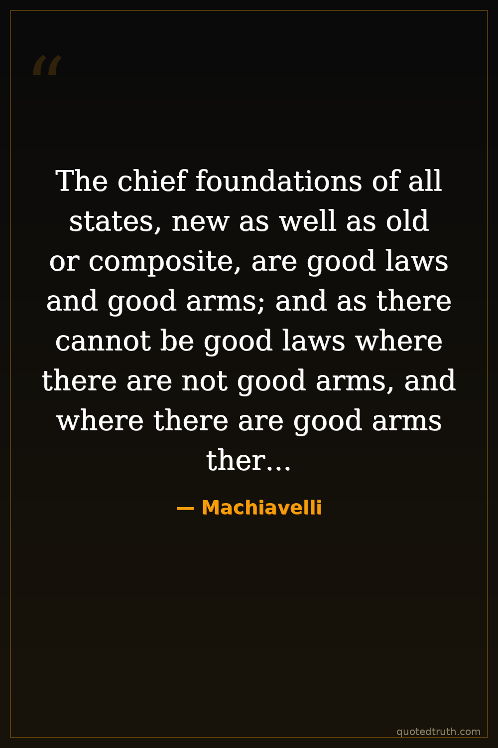 The chief foundations of all states, new as well as old or composite, are good laws and good arms; and as there cannot be good laws where there are not good arms, and where there are good arms there must be good laws, I will here omit the discussion on laws and speak of arms.