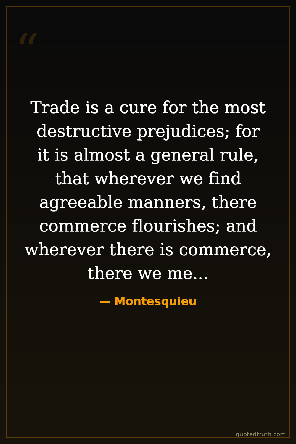 Trade is a cure for the most destructive prejudices; for it is almost a general rule, that wherever we find agreeable manners, there commerce flourishes; and wherever there is commerce, there we meet with agreeable manners.