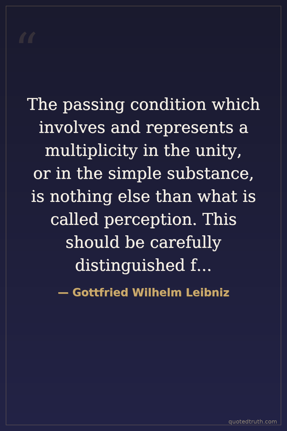 The passing condition which involves and represents a multiplicity in the unity, or in the simple substance, is nothing else than what is called perception. This should be carefully distinguished from apperception or consciousness, as will appear in what follows. In this matter the Cartesians have fallen into a serious error, in that they deny the existence of those perceptions of which we are not conscious.