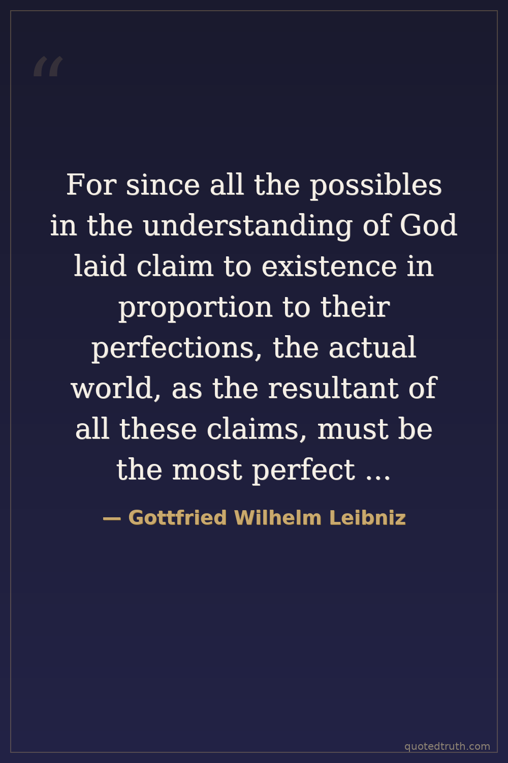 For since all the possibles in the understanding of God laid claim to existence in proportion to their perfections, the actual world, as the resultant of all these claims, must be the most perfect possible. And without this it would not be possible to give a reason why things have turned out so rather than otherwise.