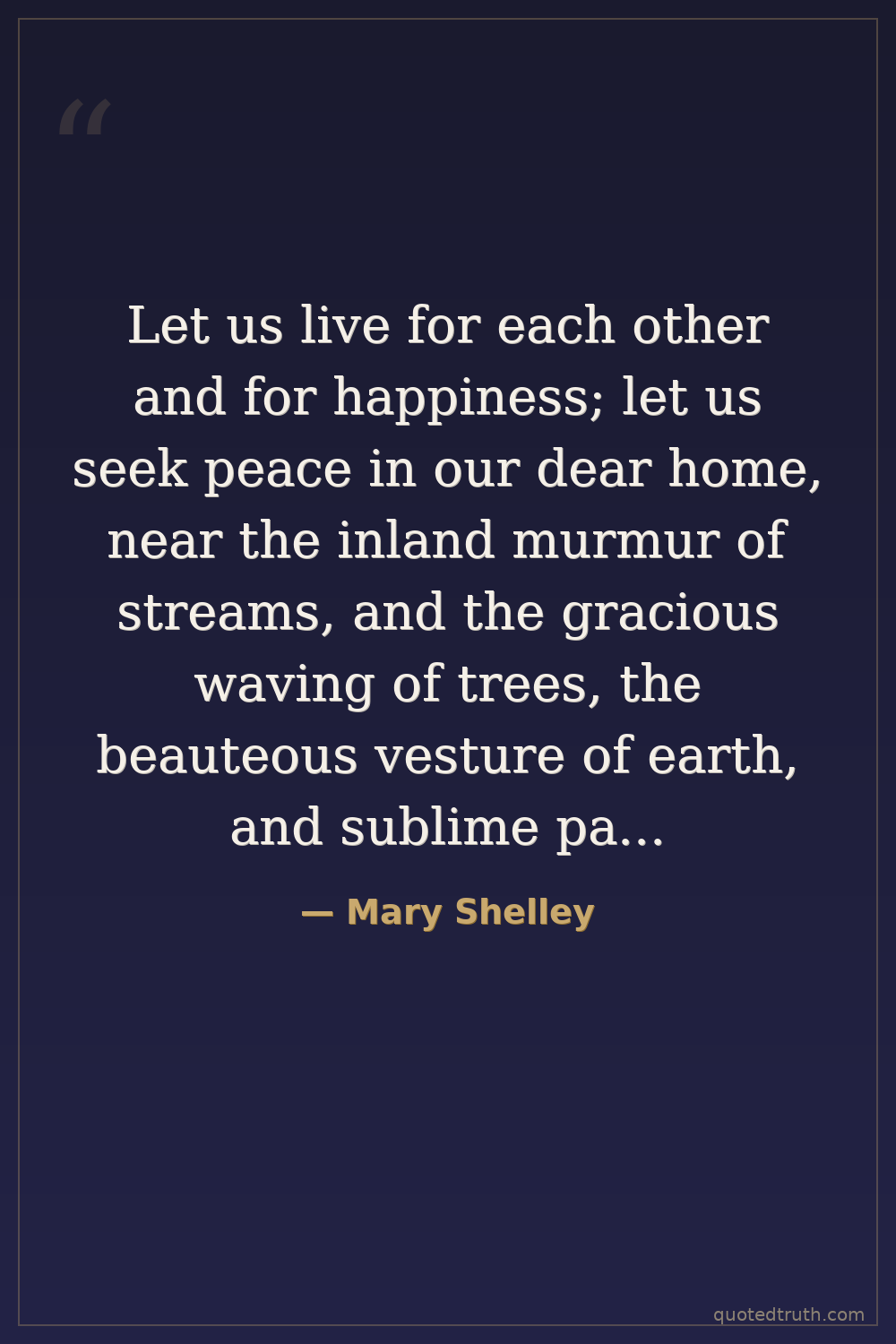Let us live for each other and for happiness; let us seek peace in our dear home, near the inland murmur of streams, and the gracious waving of trees, the beauteous vesture of earth, and sublime pageantry of the skies. Let us leave 'life,' that we may live.