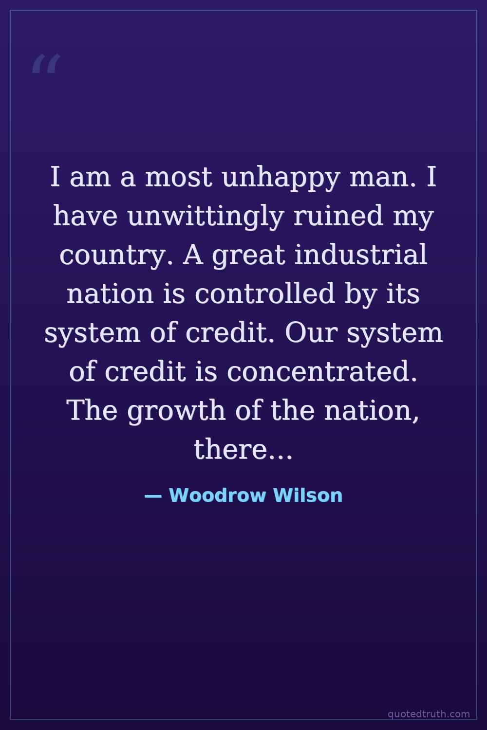 I am a most unhappy man. I have unwittingly ruined my country. A great industrial nation is controlled by its system of credit. Our system of credit is concentrated. The growth of the nation, therefore, and all our activities are in the hands of a few men. We have come to be one of the worst ruled, one of the most completely controlled and dominated Governments in the civilized world—no longer a Government by free opinion, no longer a Government by conviction and the vote of the majority, but a Government by the opinion and duress of a small group of dominant men.
