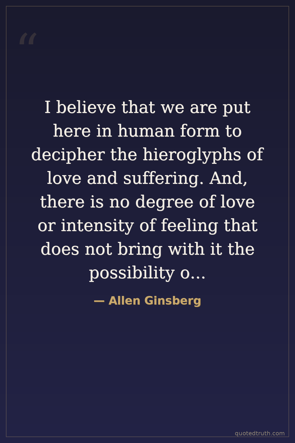 I believe that we are put here in human form to decipher the hieroglyphs of love and suffering. And, there is no degree of love or intensity of feeling that does not bring with it the possibility of a crippling hurt. But, it is a duty to take that risk and love without reserve or defense.