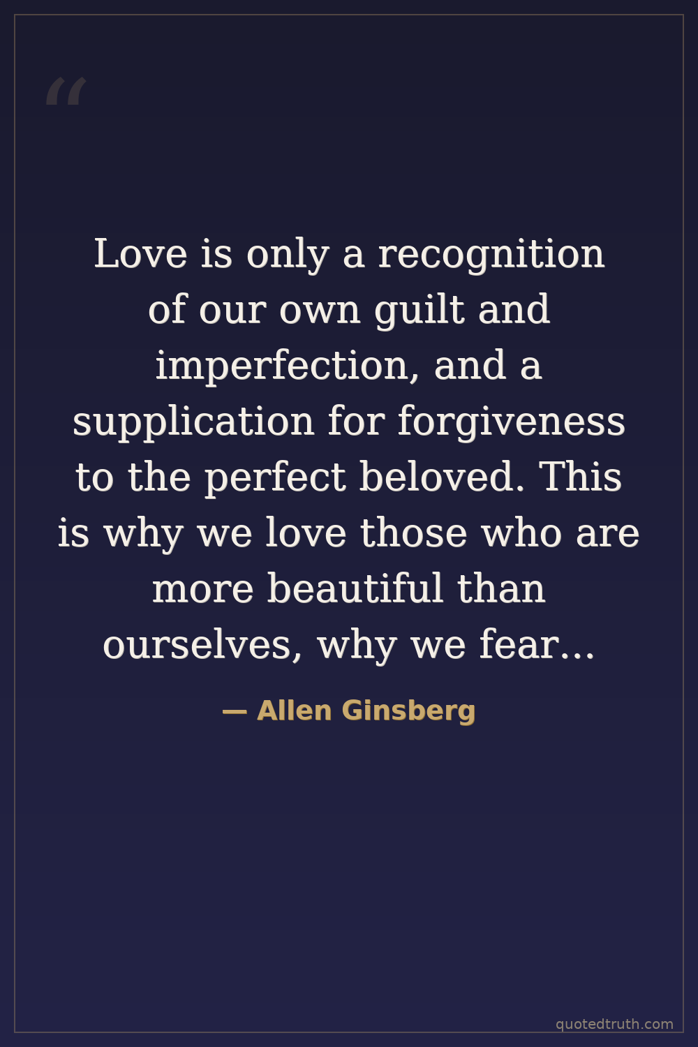 Love is only a recognition of our own guilt and imperfection, and a supplication for forgiveness to the perfect beloved. This is why we love those who are more beautiful than ourselves, why we fear them, and why we must be unhappy lovers.