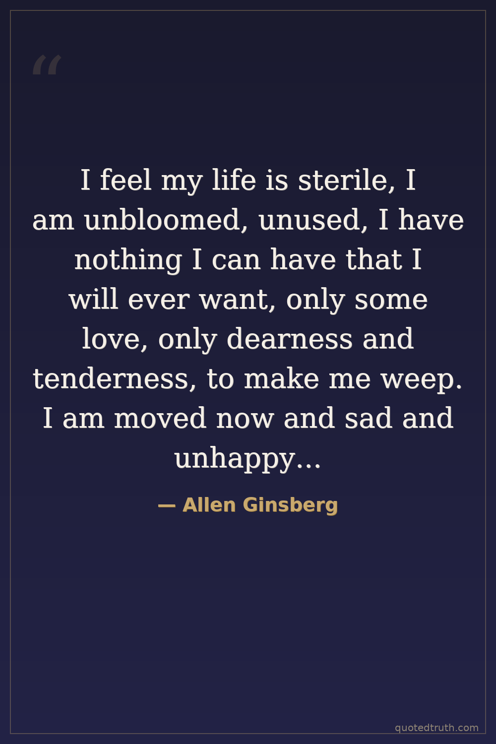 I feel my life is sterile, I am unbloomed, unused, I have nothing I can have that I will ever want, only some love, only dearness and tenderness, to make me weep. I am moved now and sad and unhappy beyond cold unhappiness, beyond any inconvenience that will cause you by my affection.