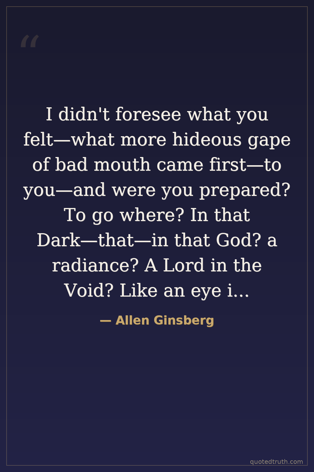 I didn't foresee what you felt—what more hideous gape of bad mouth came first—to you—and were you prepared? To go where? In that Dark—that—in that God? a radiance? A Lord in the Void? Like an eye in the black cloud in a dream? Adonoi at last, with you? Beyond my remembrance! Incapable to guess!