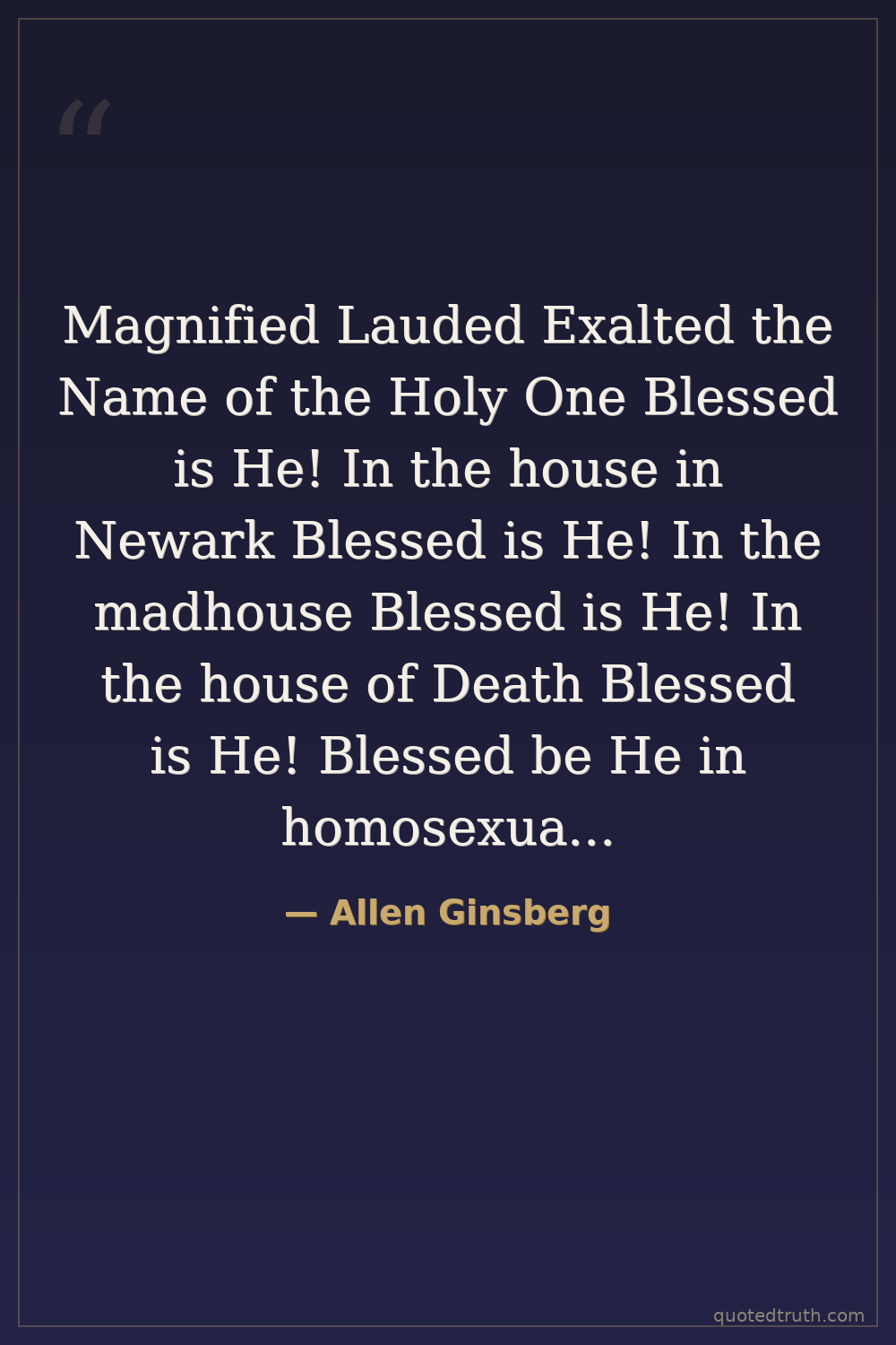 Magnified Lauded Exalted the Name of the Holy One Blessed is He! In the house in Newark Blessed is He! In the madhouse Blessed is He! In the house of Death Blessed is He! Blessed be He in homosexuality! Blessed be He in Paranoia! Blessed be He in the city! Blessed be He in the Book! Blessed be He who dwells in the shadow! Blessed be He! Blessed be He! Blessed be you Naomi in tears! Blessed be you Naomi in fears!