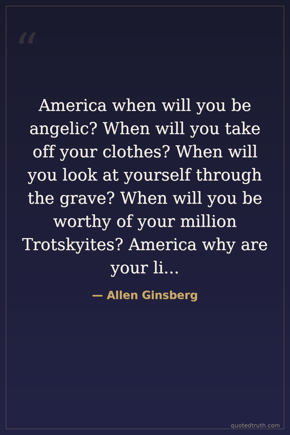 America when will you be angelic? When will you take off your clothes? When will you look at yourself through the grave? When will you be worthy of your million Trotskyites? America why are your libraries full of tears?