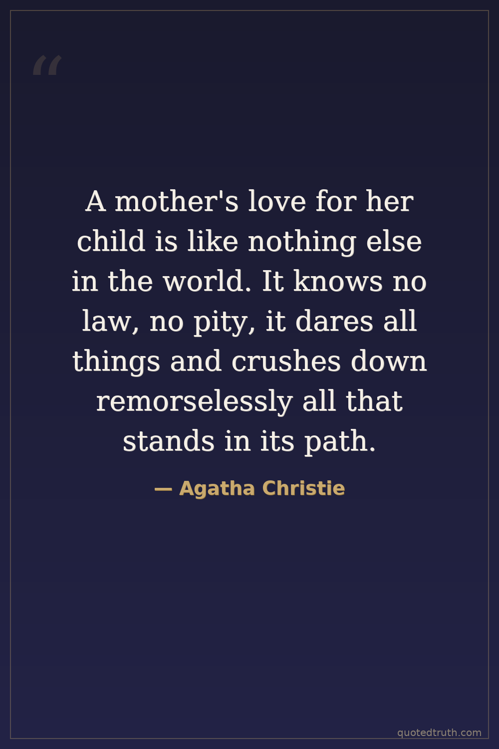 A mother's love for her child is like nothing else in the world. It knows no law, no pity, it dares all things and crushes down remorselessly all that stands in its path.