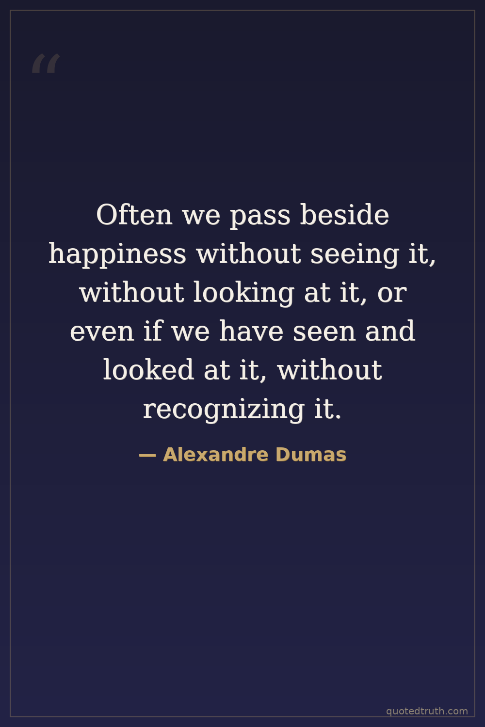 Alexandre Dumas — "Often we pass beside happiness without seeing it, without looking at it, or even…"
