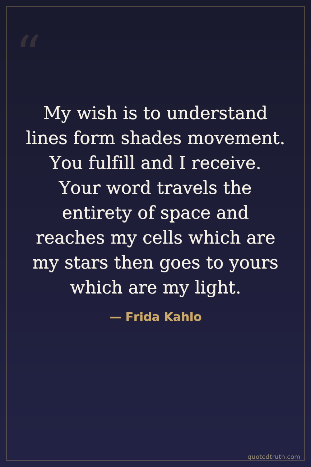 My wish is to understand lines form shades movement. You fulfill and I receive. Your word travels the entirety of space and reaches my cells which are my stars then goes to yours which are my light.