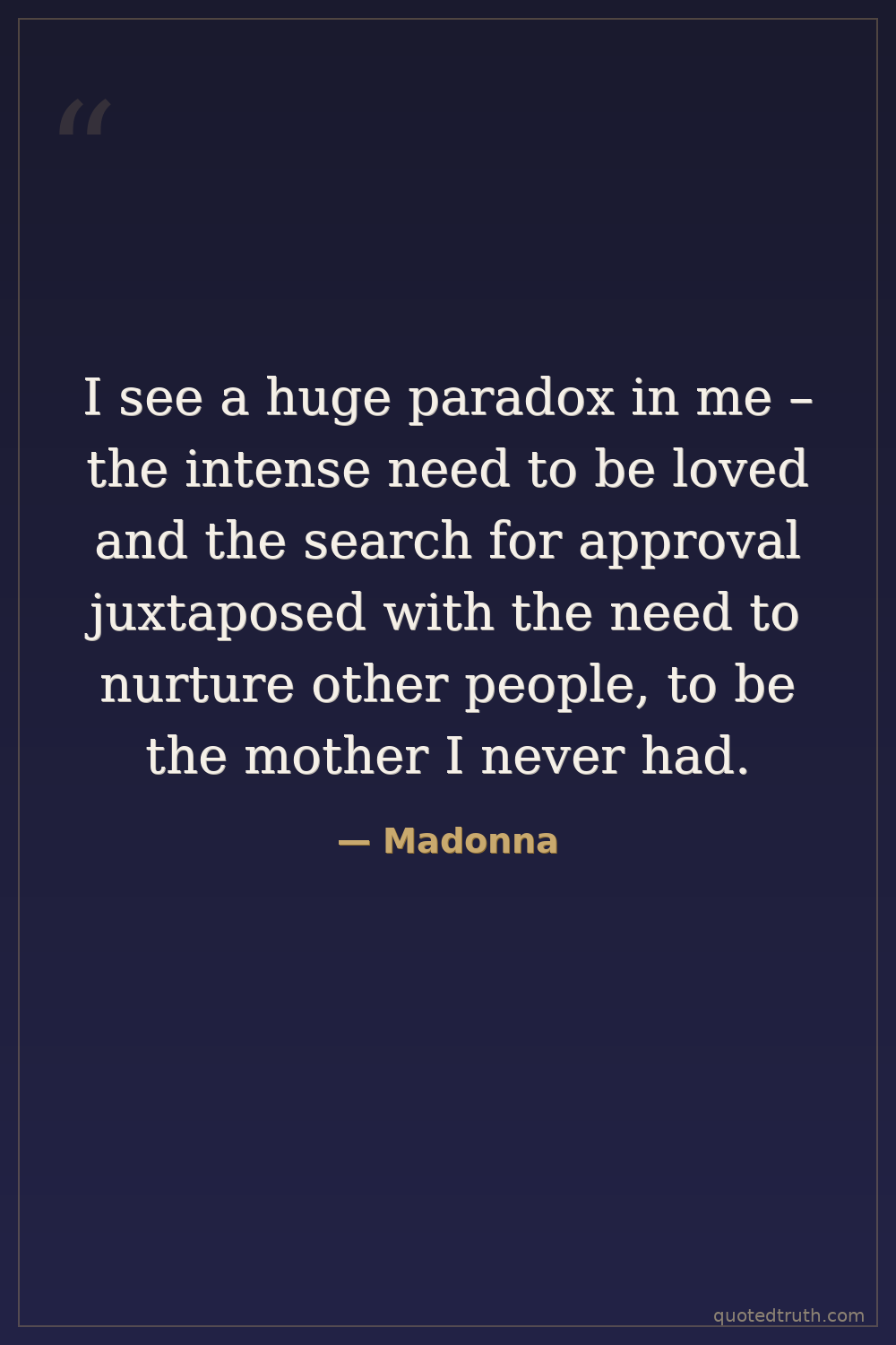 I see a huge paradox in me – the intense need to be loved and the search for approval juxtaposed with the need to nurture other people, to be the mother I never had.
