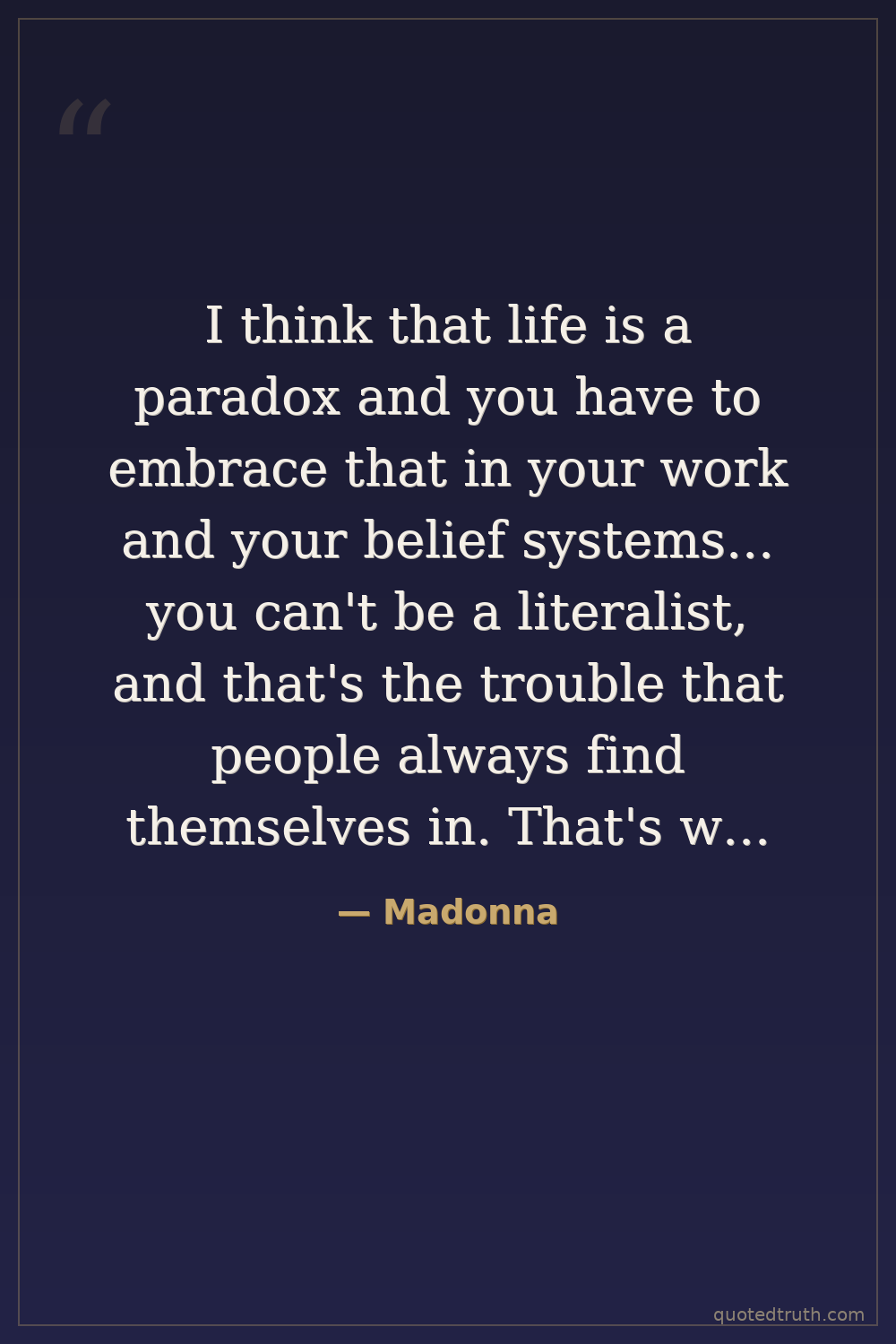 I think that life is a paradox and you have to embrace that in your work and your belief systems... you can't be a literalist, and that's the trouble that people always find themselves in. That's why people always hit a wall with any of my stuff, because you can't take it literally.