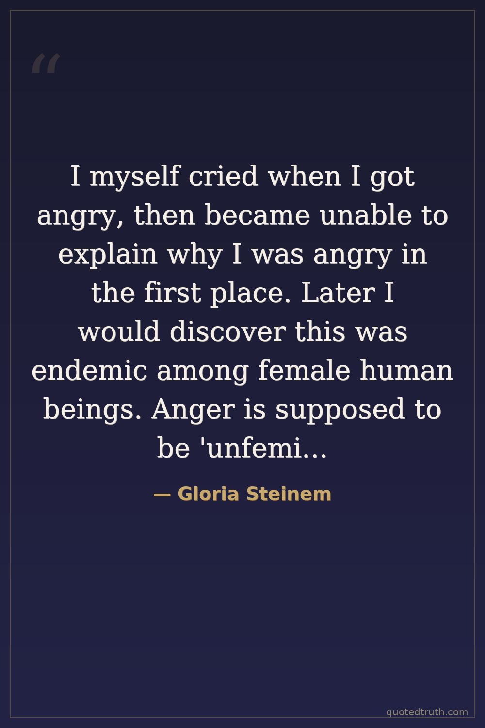 I myself cried when I got angry, then became unable to explain why I was angry in the first place. Later I would discover this was endemic among female human beings. Anger is supposed to be 'unfeminine' so we suppress it - until it overflows. I could see that not speaking up made my mother feel worse. This was my first hint of the truism that depression is anger turned inward; thus women are twice as likely to be depressed.