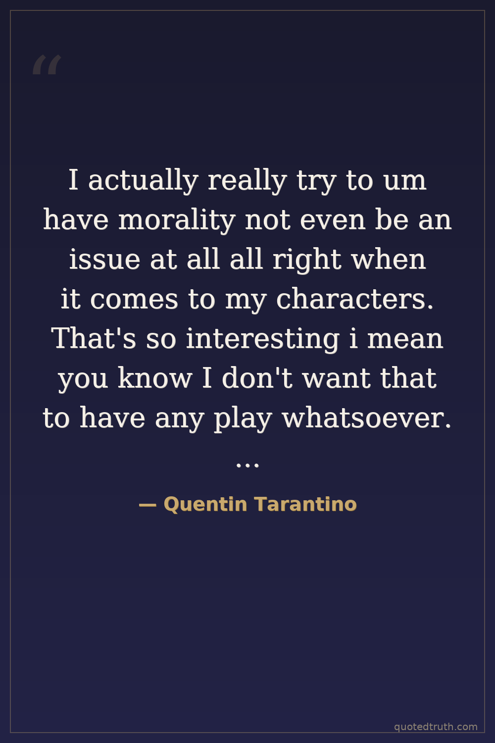 I actually really try to um have morality not even be an issue at all all right when it comes to my characters. That's so interesting i mean you know I don't want that to have any play whatsoever. i That would be me commenting on them that is me sticking my big nose into their lives. and then their philosophies i let them be who they are.