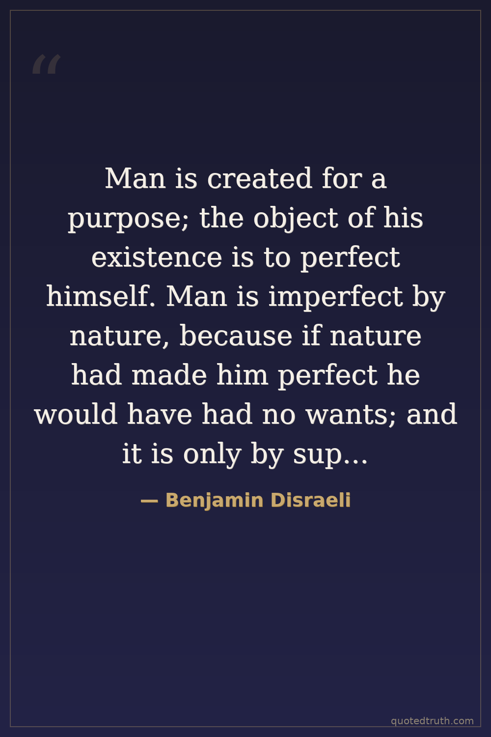 Man is created for a purpose; the object of his existence is to perfect himself. Man is imperfect by nature, because if nature had made him perfect he would have had no wants; and it is only by supplying his wants that utility can be developed. The development of utility is therefore the object of our being, and the attainment of this great end the cause of our existence.