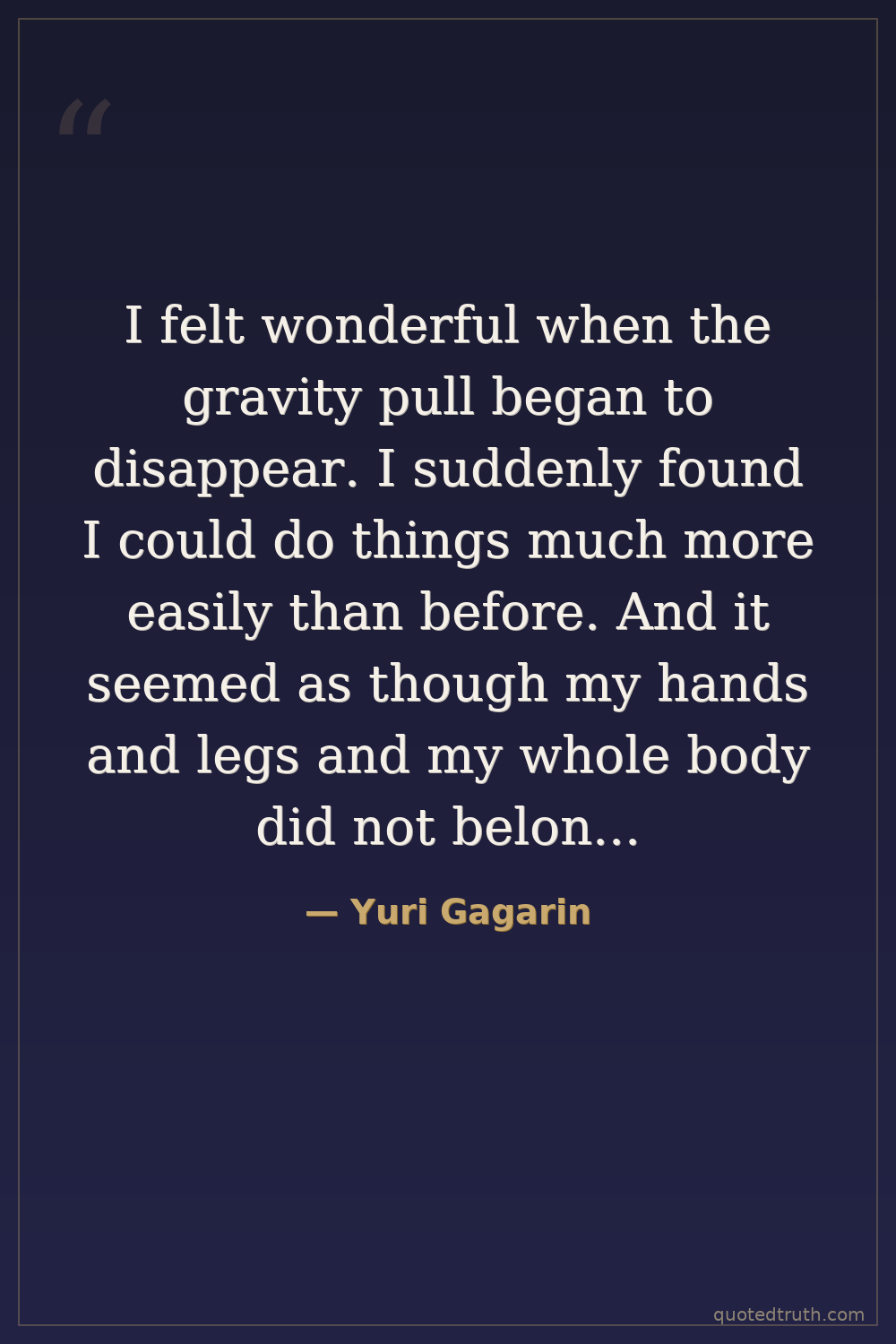 I felt wonderful when the gravity pull began to disappear. I suddenly found I could do things much more easily than before. And it seemed as though my hands and legs and my whole body did not belong to me. They did not weigh anything. You neither sit nor lie, but just keep floating in the cabin. All the loose objects likewise float in the air and you watch them as in a dream.