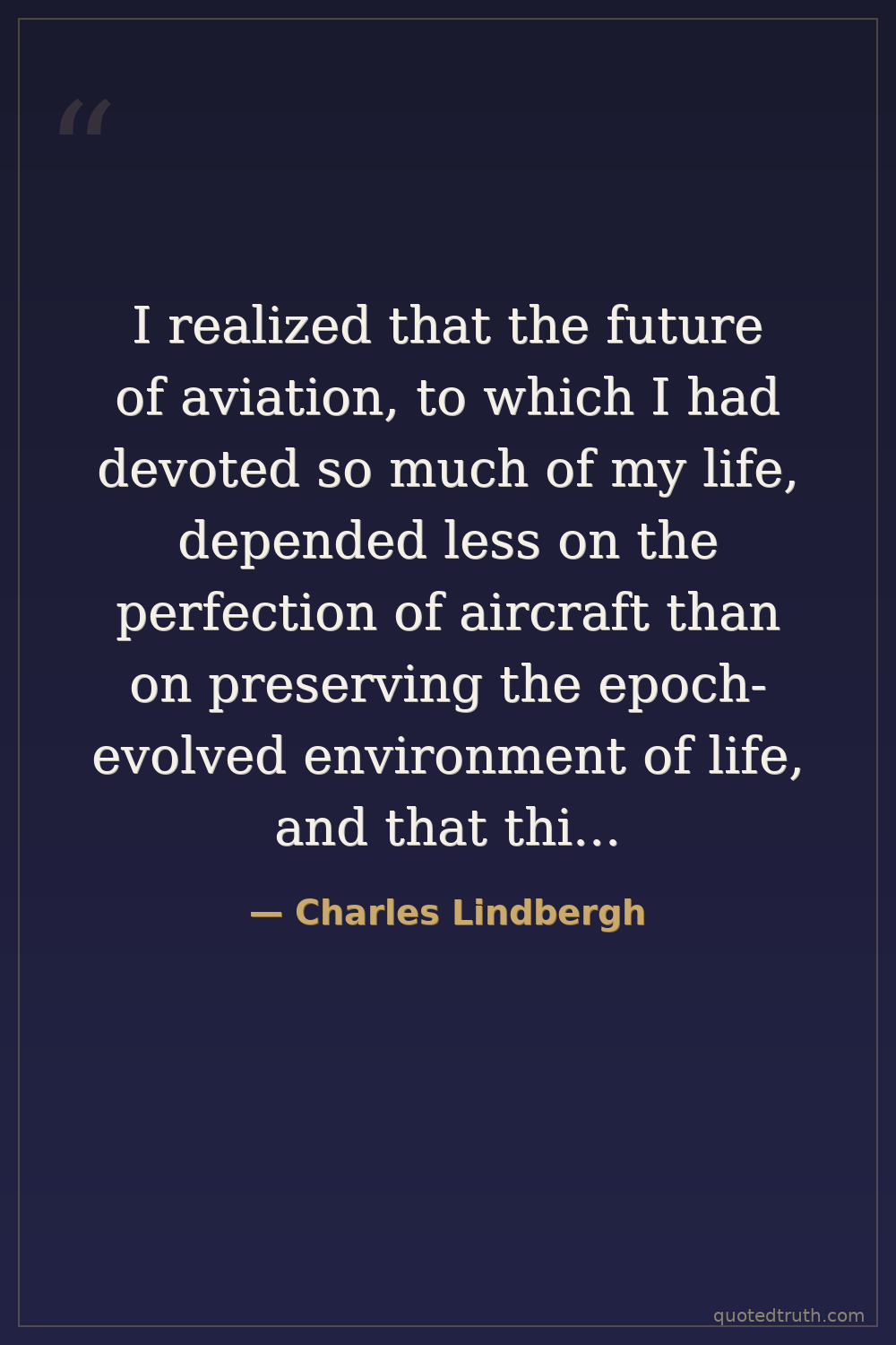 I realized that the future of aviation, to which I had devoted so much of my life, depended less on the perfection of aircraft than on preserving the epoch-evolved environment of life, and that this was true of all technological progress. — Charles Lindbergh Modern Transatlantic flight